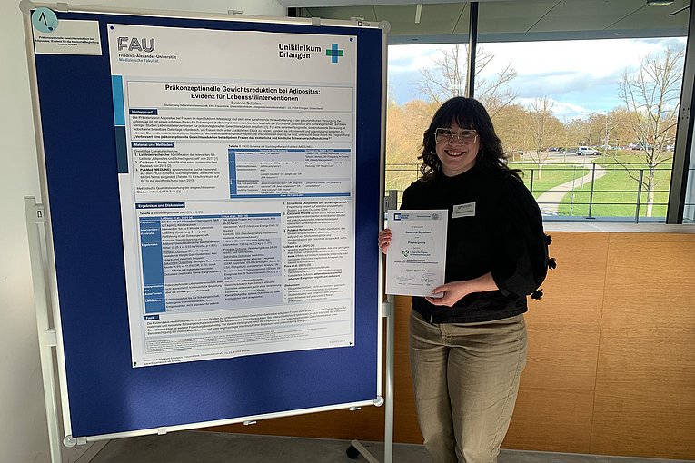 Studierende des Lehrstuhls reichten ihre wissenschaftlichen Poster ein und präsentierten sie in der Postersession. Besonders beeindrucken konnte Susanne Scholten aus der 3. Kohorte, die einen der mit 300 Euro dotierten Posterpreise gewann. Sie beschäftigte sich in ihrer Arbeit mit dem Thema „Präkonzeptionelle Gewichtsreduktion bei Adipositas: Evidenz für Lebensstilinterventionen“ – ein zunehmend relevantes Thema für die Gesundheitsversorgung.